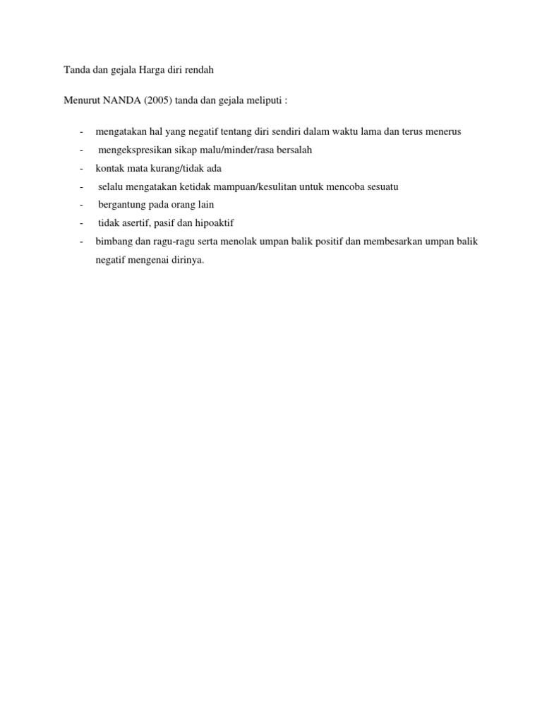 Namun, kasus terakhir jarang terjadi. 1 harga diri rendah (situasional) disusun untuk memenuhi tugas presentasi mata kuliah intervensi krisis pada program studi ilmu 10 b. Harga diri rendah adalah penilaian pribadi terhadap hasil yang dicapai dengan menganalisa seberapa jauh perilaku memenuhi ideal diri (stuart dan sundeen, 1998 :227). Gangguan harga diri yang disebut sebagai harga diri rendah dan dapat terjadi secara : Documents similar to tanda dan gejala harga diri rendah.